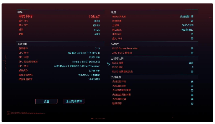 使用《赛博朋:2077》测试,最高画质光线追踪:超级,帧生成关闭,DLSS质量:自动,帧率仅83,降低光线追踪档位到低,帧率可提升到108,个人感觉画质也没有差很多,毕竟清晰度到位了。