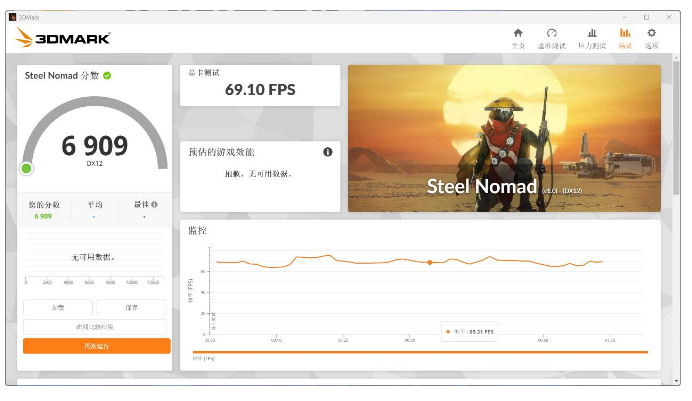 3DMARK Steel Nomad默认预设测试,整机得分6909,显卡测试帧率69.1,稍高于同配平均分6883。