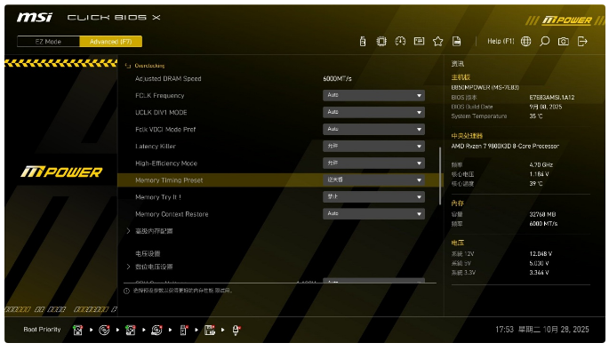 在高级设置中,微星B850MPOWER还提供了Latency Killer和High-Effciency Mode(低延迟、高带宽)给用户,在Menory Timing Preset(自动小参)还有多个档位可选,无脑选逆天香即可,低延迟高带宽可以大幅度提升内存性能,免费的功能建议各位及时开启。
