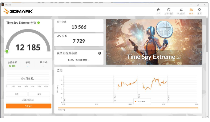 3DMARK Time Spy Extreme测试中,整机得分12185,显卡得分13566,CPU得分7729。