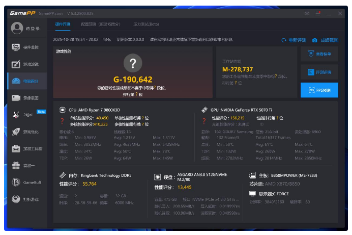 使用GamePP跑分,游戏性能得分190642,工作站性能得分278737,因为使用PCIe3.0固态的关系,总得分稍低,不过整体依旧处于s段位水准。