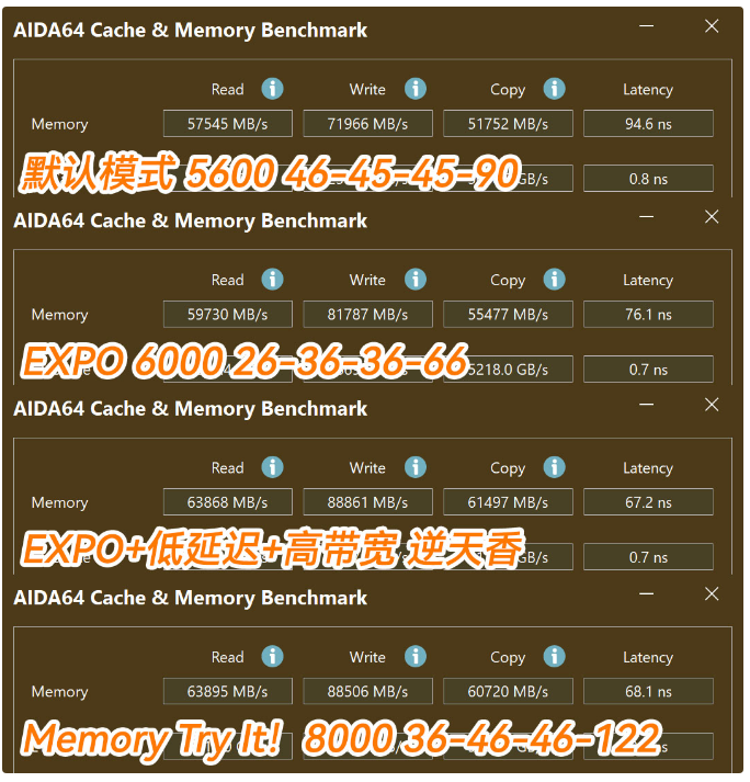 内存这边就有意思了,手头的金百达星刃C28默认频率5600,时序46-45-45-90,开启EXPO后,读、拷贝小幅度提升,写入提升近15%,延迟从94.6ns降低到76.1ns,提升非常明显,再开启微星B850MPOWER主板自带的Latency Killer和High-Effciency Mode以及Menory Timing Preset(逆天香),读写拷贝速率还可进一步提升8%左右,延迟降低到67.2ns,而使用Memory Try It!开启8000 36-46-46-122后,免调参可直接点亮,同步开启低延迟高带宽,成绩还不如EXPO+低延迟+高带宽+逆天香,当然这里并没有摸到内存的极限,非极客用户还是直接用主板设置好了。