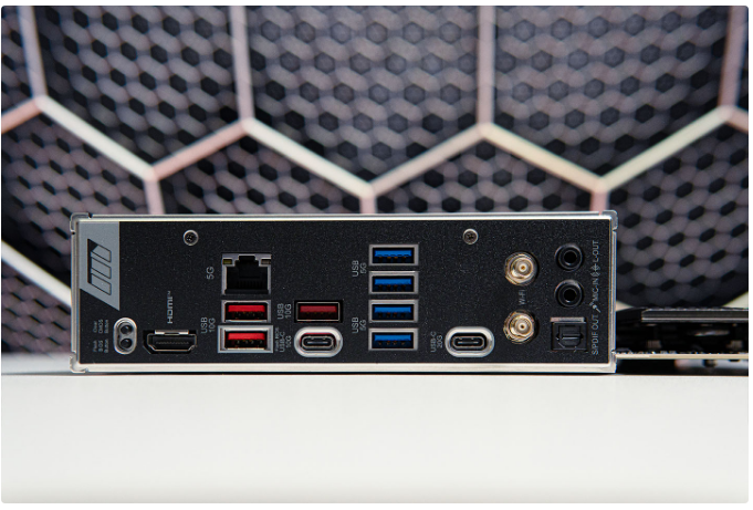 尾部接口按键包含ClearCMOS、HDMI、5G Lan、USB10Gbps Type-A*3、USB 5Gbps Type-A*4、USB 10Gbps Type-C、USB 20Gbps Type-C、WiFi天线接口、光纤音频口、3.5mm音频口*2,接口算是比较丰富。