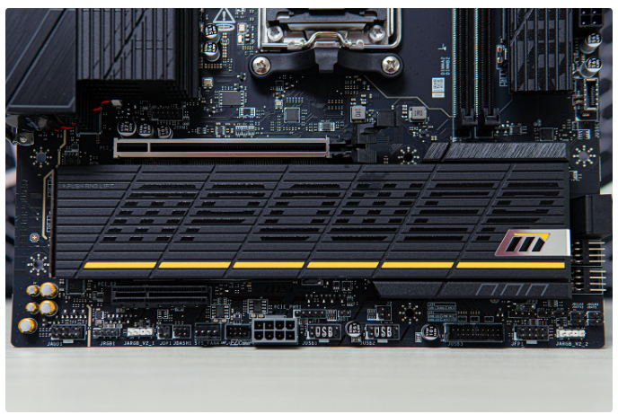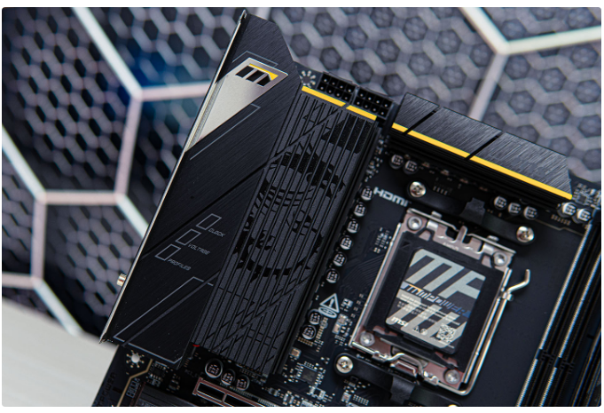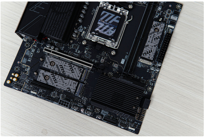 微星B850MPOWER主板双内存条设计把空出位置留给了M2固态,正面三个固态位分别支持PCIe5.0*4、PCle5.0*4、PCle4.0*4,散热装甲均支持快拆,上下面已预装散热贴。
