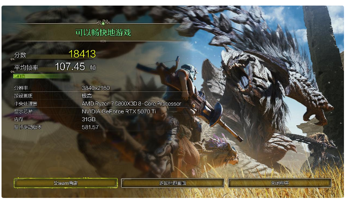 使用《怪物猎人:荒野》测试,开启最高画质,开启帧生成,平均帧率107,体验不错,不过这款游戏默认画面雾蒙蒙的,有兴趣可以找下民间大神的画质优化包。