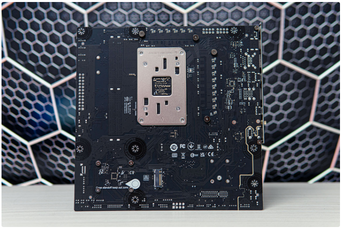 主板背面可以看到CPU位置进行了金属加固,下方还有一个M.2固态位,其支持PCIe4.0*2规格,小板上实现4固态位还是非常少见的。