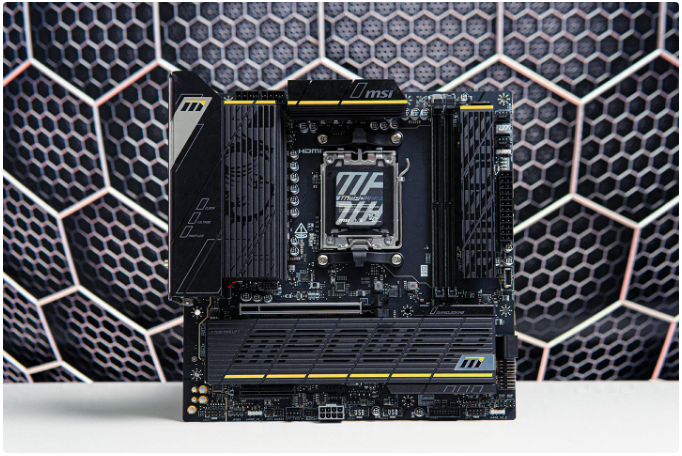 微星B850MPOWER整体设计风格非常硬朗,光面+磨砂+栅格纹理辨识度拉满,作为MATX主板,其元器件布局相当紧凑,整体重量则来到了1455g,分量感十足。