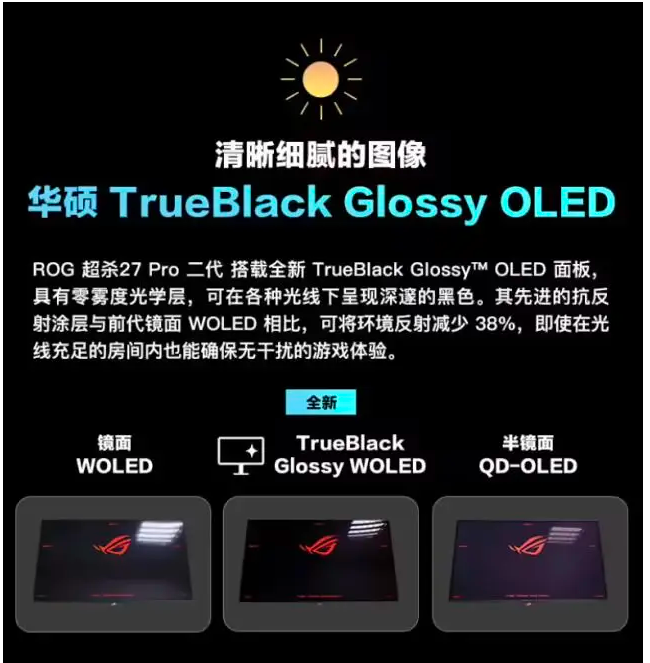 该机搭载了 LGD 的第四代 WOLED 面板,实现了 15% 峰值亮度提升、25% 显色体积增加、60% 使用寿命延长,支持以 HD 720Hz 或 QHD 540Hz 显示;GtG 灰阶响应时间 0.02ms,峰值亮度达 1500 尼特,获得 VESA DisplayHDR True Black 500 认证,色域容积 99.5%,TrueBlack Glossy 涂层技术兼顾了零雾度显示效果和低光反射。