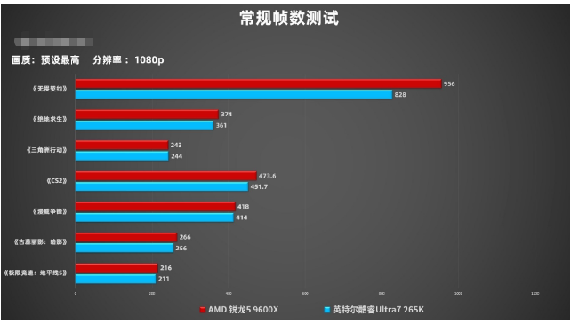 1080p分辨率下,AMD 锐龙5 9600X平台在帧数表现领先英特尔酷睿Ultra7 265K平台6款游戏,只有一款游戏帧数惜败于对手,综合表现更强势,尤其是《无畏契约》这款游戏优势极大。造成这样的帧数差异,核心原因在于AMD 锐龙 9000系列升级了Zen5架构,IPC性能大幅升级,并且优化了共享缓存设计,主攻游戏痛点,因为游戏在运行时,会反复调用角色、场景等数据,锐龙9000系列的大缓存能将这些高频访问数据即时存储,减少处理器向内存调取数据的次数,从而降低游戏延迟,AMD 锐龙 5 9600X在多数游戏中帧数更高,这也说明大缓存如今十分重要,游戏玩家攒机时需要更加重视。
