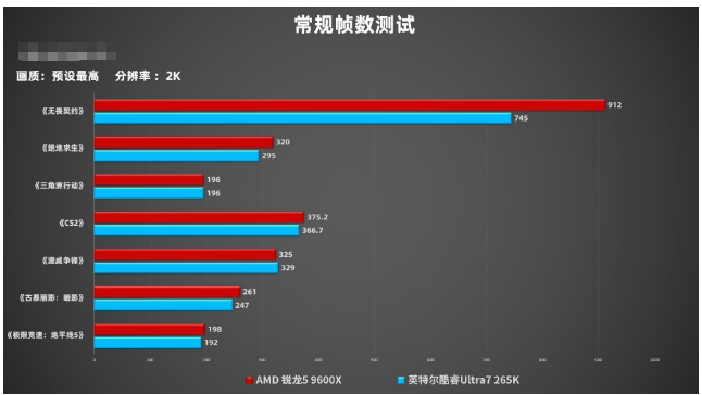 2K分辨率整体帧数趋势相差不大,这次AMD锐龙5 9600X平台有5款游戏帧数表现更好,在《三角洲行动》中两套平台帧数打平,《漫威争锋》中英特尔酷睿Ultra7 265K平台帧数更高。