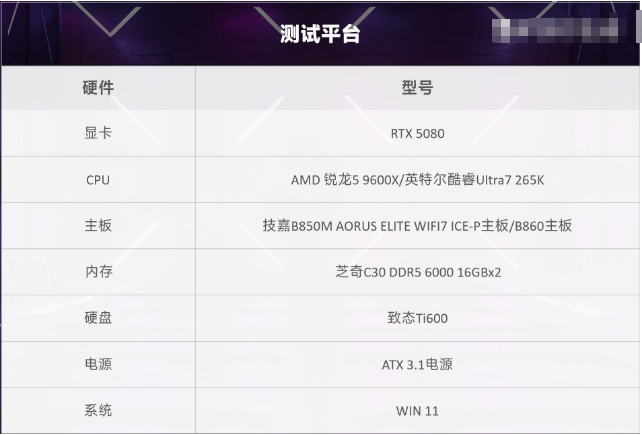 单从参数上看,AMD 锐龙5 9600X虽然核心线程和频率不如英特尔酷睿Ultra7 265K,但其实算下来也没差多少,因为AMD 锐龙5 9600X保持了全大核心设计,而英特尔这款酷睿Ultra7 265K并无超线程设计,性能核只有8核心8线程,剩下全是能效核。此外性能核频率也只相差0.1Ghz。而现在对于游戏影响极大的缓存容量上,AMD 锐龙5 9600X却更多,所以实际游戏测试预计仍会有更好表现。下面我们就开始测试,测试平台如下: