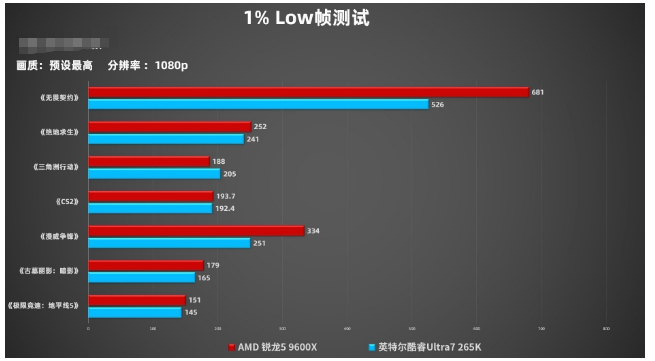 我们这次除了常规帧数外也测试了游戏1% LOW帧数,1% LOW帧越高就越能显著减少游戏关键操作时的延迟感,尤其是网游,会让技能释放、瞄准射击等动作更精准跟手,同时提升复杂场景下的沉浸体验,是目前大部分玩家十分看重的游戏实战成绩,下面为 1080P 分辨率下两套平台的1% LOW帧表现。