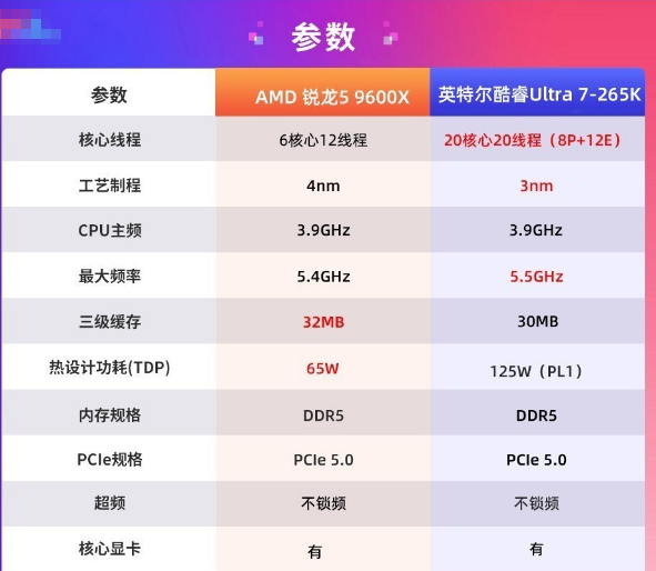 参数方面,AMD 锐龙5 9600X拥有6核心12线程,其最大的优势在于三级缓存更大、功耗更低,并且在双11促销期间,价格便宜600元以上。英特尔酷睿 Ultra7 265K 的强项则在于核心线程规格与最大睿频,在性能混合架构的加持下,它拥有20 核心20线程,包含8个性能核和12个能效核,其中性能核最大频率达到5.5GHz。