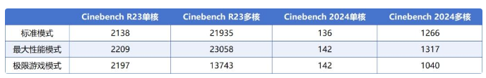 首先来看一下生产力方面的测试,我们在三个模式下都进行了跑分,开启X3D鸡血模式后,毫无疑问的是在最大性能和极限游戏模式下,单核性能都有了显著提升,大约提升了3.3%左右。Cinebench R23跑分中在最大性能下单核性能从2138提升至2209,极限游戏模式下提升至2197。同时在多核表现中也有大约5%左右的。在Cinebench 2024中也有类似提升,单核性能提升4%,多核性能提升4.8%。