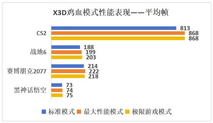 游戏测试上我们简单测试了四款游戏,分辨率设置为1080P,CS2为最低画质,其余游戏都是最高画质,并且都是在默认的状态下。CS2比较吃处理器的单核性能,所以在开启最大性能模式以及极限游戏模式下平均帧都提升了6.7%左右。战地6中在极限游戏模式下表现最好,大约平均帧提升了7.9%,最大性能模式则能提升5.8%。在赛博朋克2077中则是最大性能模式下提升最大,大约提升了3.7%。黑神话悟空中也有小幅提升,两个模式下大约为1.3%和2.7%。