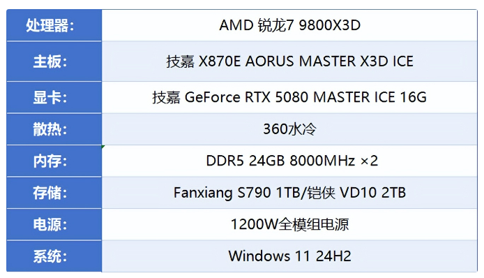 我们搭建了如下配置的测试机,处理器使用了游戏神U 9800X3D处理器,内存是两条24GB DDR5 8000MHz的。显卡同样也是技嘉的RTX 5080超级雕ICE。
