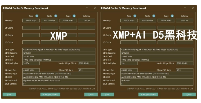 在开启XMP的状态下此时读取速度57268 MB/s,写入速度80176 MB/s,复制速度55566 MB/s,延迟79.2ns。开启D5黑科技2.0后,读取速度提升11%来到63609 MB/s,写入速度提升10%来到88578 MB/s,复制速度提升5%来到58788 MB/s,延迟方面也降低了16%来到66.9ns。