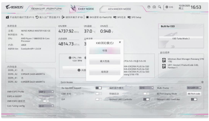 X3D鸡血模式2.0一共提供了三种预设模式:标准、最大性能以及极限游戏。除了在BIOS中进行调节外,在技嘉官网还提供了专门的应用程序来切换模式。