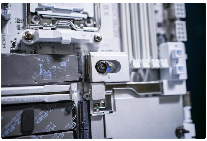 在拓展性上,提供了5条M.2插槽,其中2条支持PCIe5.0×4,2条支持PCIe4.0×4,还有1条支持PCIe4.0×2。前两条的PCIe5.0 SSD搭载了M.2弹性背板,一来可以避免SSD弯曲,二来可以让SSD与背板接触更紧密从而提升散热能力。堆叠式M.2散热装甲拥有更大的散热表面积加上剖沟设计可以让气流带走热量。针对PCIe5.0 SSD的发热严重问题是很好的解决措施。此外所有的散热装甲都采用了快易拆设计,只需扳动旋钮即可取下。左侧也安装了磁铁,解决了此前散热装甲对不准,找不到接口的问题。