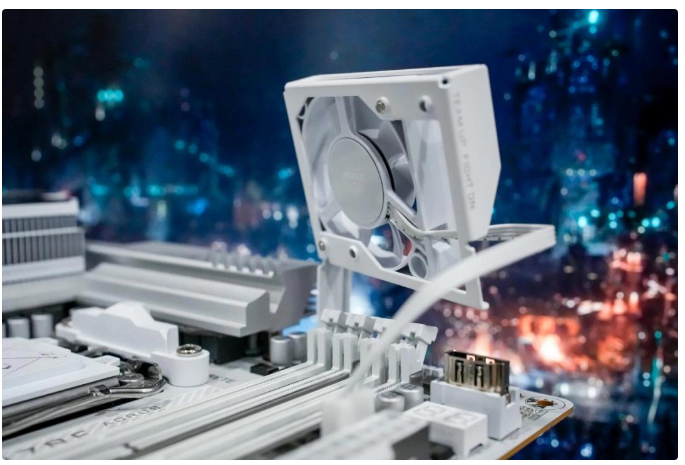 在内存方面拥有4条DDR5内存插槽,最高支持9000MT/s,容量最高支持256GB。包装内还附带了一个内存散热风扇,大约可降低10度左右,让高频内存运行时更稳定。同时还搭载AI D5黑科技2.0,进一步提升内存性能。
