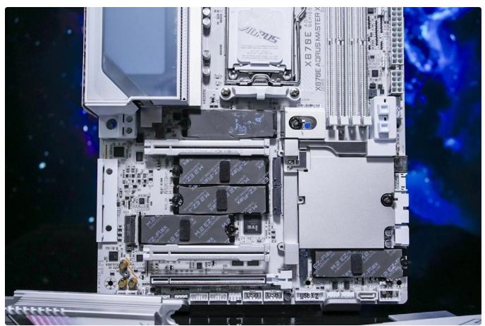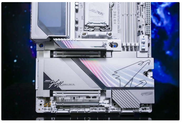技嘉X870E X3D超级冰雕主板的装甲、PCB板、接口等等通通都是白色,当然作为次旗舰定位这也是应该的,非常适合搭建纯白主机。在VRM散热装甲区域点亮后会呈现出无限镜灯效,极富氛围感。拓展区域的装甲运用了多层材料组合,左边镜面材质,右侧则进行了激光雕刻处理,还有一个硕大的雕头logo。