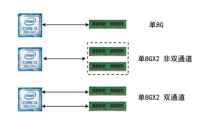 1双通道(两根内存):就像把马路拓宽成双车道。在限速(频率)不变的情况下,因为车道数(位宽)翻倍了,单位时间内能通行的车辆(数据)总量(带宽)也几乎翻倍。