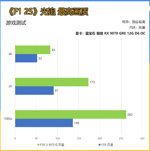 在开启全部光追选项后,对性能要求激增,蓝宝石 极地 RX 9070 GRE 12G D6 OC对于4K分辨率则相对吃力,但开启FSR 3帧生成后能达到83帧,对于赛车游戏来说仍算得上流畅。