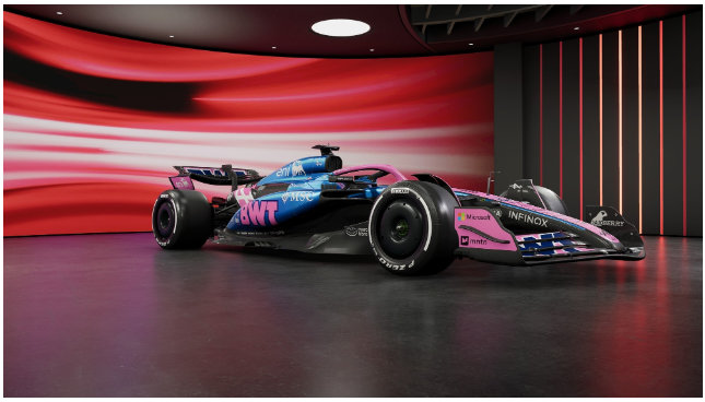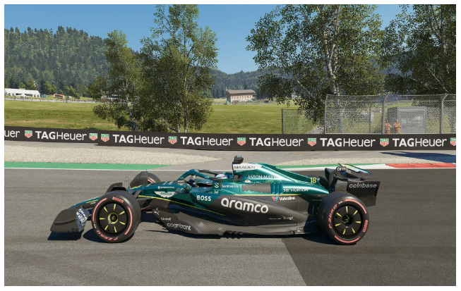 F1赛车整体采用碳纤与漆面,在阳光下反射率较高,原本轮胎处漆黑的光线,在开启光追+路径追踪后,被间接照明能够清晰显示与车身的连接结构。