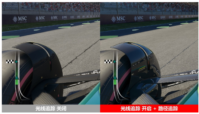 另外值得注意的是,轮胎粉色的条纹,在开启光追后,颜色会变淡,这也符合我们日常生活中的观感。
