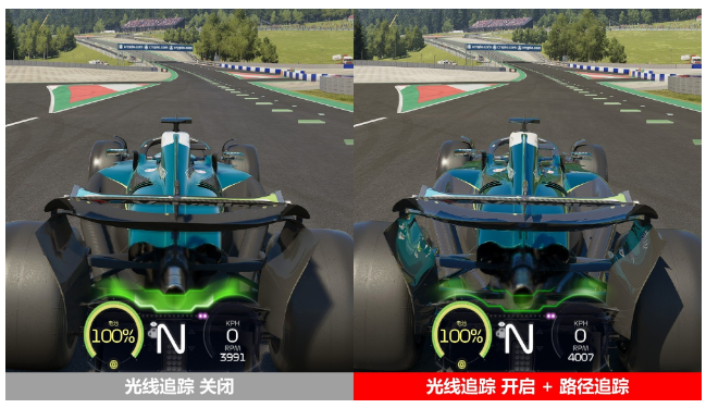 下面来看看《F1 25》在光线追踪关闭与全开下的画面表现差异。游戏中画质调节是实时的,且在车库中即可看出差异。