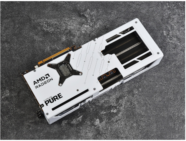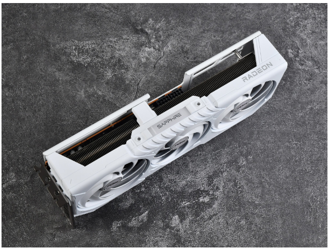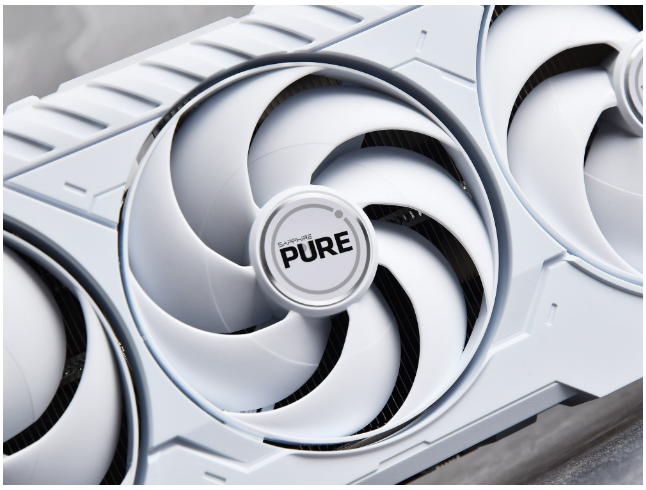 蓝宝石 极地 RX 9070 GRE 12G D6 OC卡身整体为“雪白色”,尺寸为320×120.25×61.6mm,采用三风扇全尺寸设计,占用3槽空间。主动散热部分采用2大1小的3个7叶飞翼轴流风扇,搭配双滚珠轴承结构,可高效散热并延长风扇使用寿命。