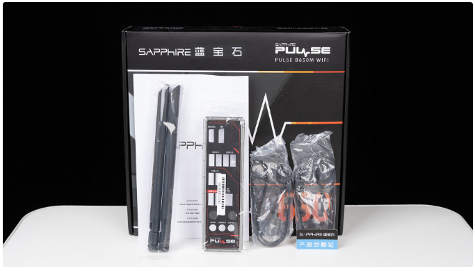 熟悉蓝宝石显卡的朋友应该都知道,PULSE系列其实就是对应白金版,这款PULSE脉动B650M WIFI包装正面就有类似于脉搏那样跳动图案,除外就是AMD B650芯片组、AM5插槽这些官方设定,设计风格简洁低调。