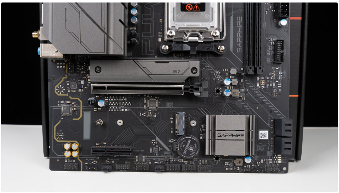 主板配备两组M.2插槽,上方带散热马甲的是PCIe 5.0X4,如果要安装GEN5固态建议加购第三方散热器,下方则是另外一组PCIe 4.0X4。