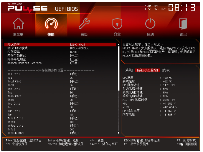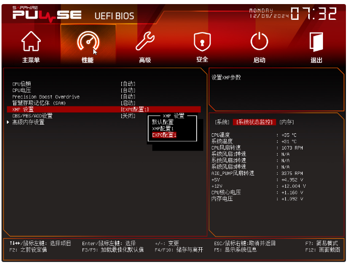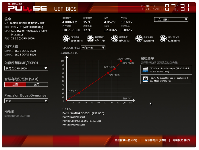 首先当然要体验一下BIOS功能,进入BIOS后映入眼帘的是主板简易模式,看起来就挺有大厂风范,属于分区功能设计,上方显示硬件基本信息,下方加入了XMP/EXPO超频选项、SAM技术开关、PBO开关、风扇曲线模式以及启动顺序。另外PULSE系列主题色是红色的,而NITRO系列是蓝色的,能很好区分开来就不错。