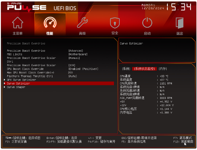 再进入PBO选项,这里AMD本来的通用模块了,包括Curve Optimizer和全新Curve Shaper进阶功能也是齐全的,这里就先为锐龙7 9800X3D进行了PBO 2相关调整操作。