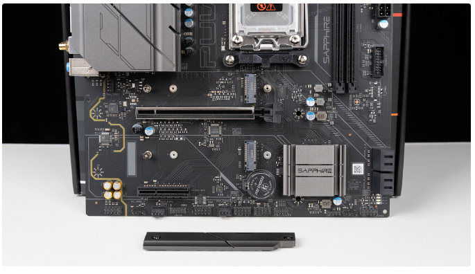 PULSE脉动B650M WIFI外观设计,第一眼就感觉风格和白金版显卡类似,均采用简洁线条和低调主题色相辅相成,散热马甲颜色是枪灰色而不是预想之中的黑色,主板线有自己想法也挺不错。值得留意的是虽然它属于MATX主板,但实际尺寸只有244x235mm,相比标准MATX缩减了右侧的空间,对于小机箱兼容性更好。