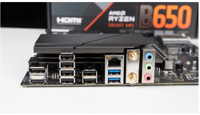 PULSE脉动B650M WIFI后置I/O接口一览,从左到右分别是1*DisplayPort、1*HDMI、6*USB 2.0、2*USB 3.2、1*RJ45(网卡为RTL8111K)、1*Wi-Fi 6模块以及三组音频口(ALC897),千元以内完全管饱。