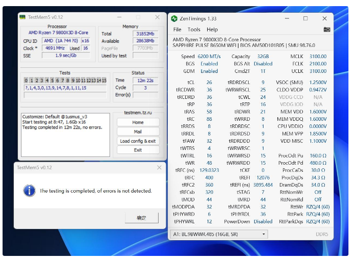 在CPU体质基本合格情况下,在PULSE脉动B650M WIFI上能达成DDR5 6200C26-36-36-58和小参缩紧的手动超频结果,FCLK频率也能小超到2100MHz,当然tREFI值还是没找到地方调节,在1.6V内存电压和1.25V SOC电压下,完美通过TestMem5 1usmus_V3烤机测试。