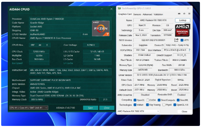 配置简单介绍一下,锐龙7 9800X3D已经处于PBO 2设置中,内存会搭配DDR5 6200C26 16GB*2(下方超频设置),显卡蓝宝石自家RX 7900 XTX白金版,安装最新AMD Adrenalin 24.12.1显卡驱动,并开启Resizable RAR技术最大化显卡性能,操作系统是Windows 11 24H2最新版本。
