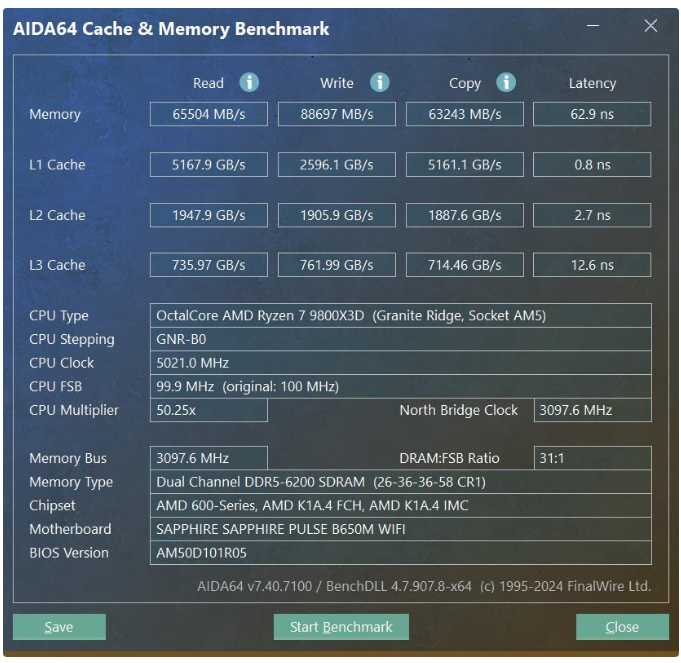 AIDA64内存和缓存测试,9800X3D+PULSE脉动B650M WIFI读取65504 MB/s,写入88697 MB/s,复制63243 MB/s,内存延迟为62.9ns,性能表现还是不错的,如果能上6400C26杀进60 ns以内是无压力的。