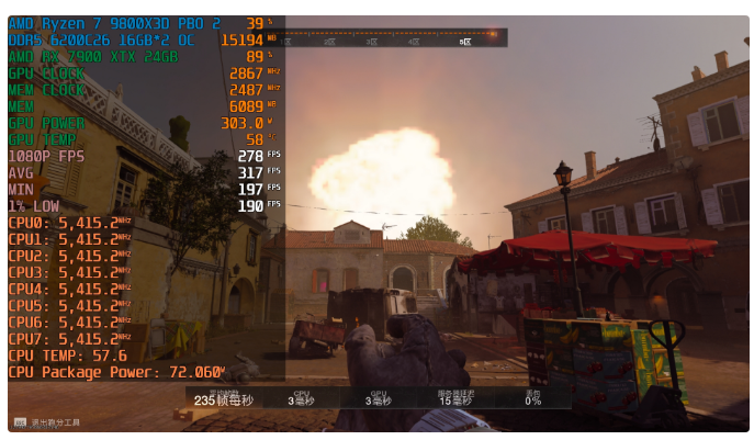 9800X3D+PULSE脉动B650M WIFI+RX 7900 XTX 24GB平均帧数317fps,1% LOW帧数190fps