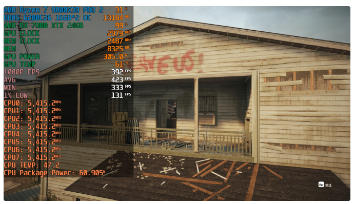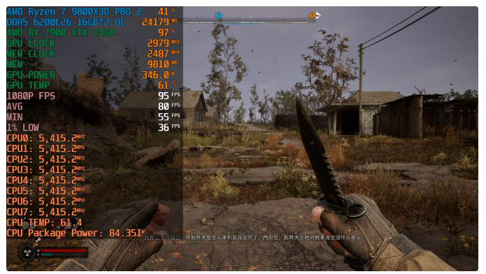 9800X3D+PULSE脉动B650M WIFI+RX 7900 XTX 24GB平均帧数80fps,1% LOW帧数36fps