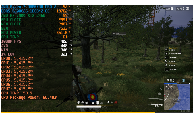 9800X3D+PULSE脉动B650M WIFI+RX 7900 XTX 24GB平均帧数448fps,1% LOW帧数321fps