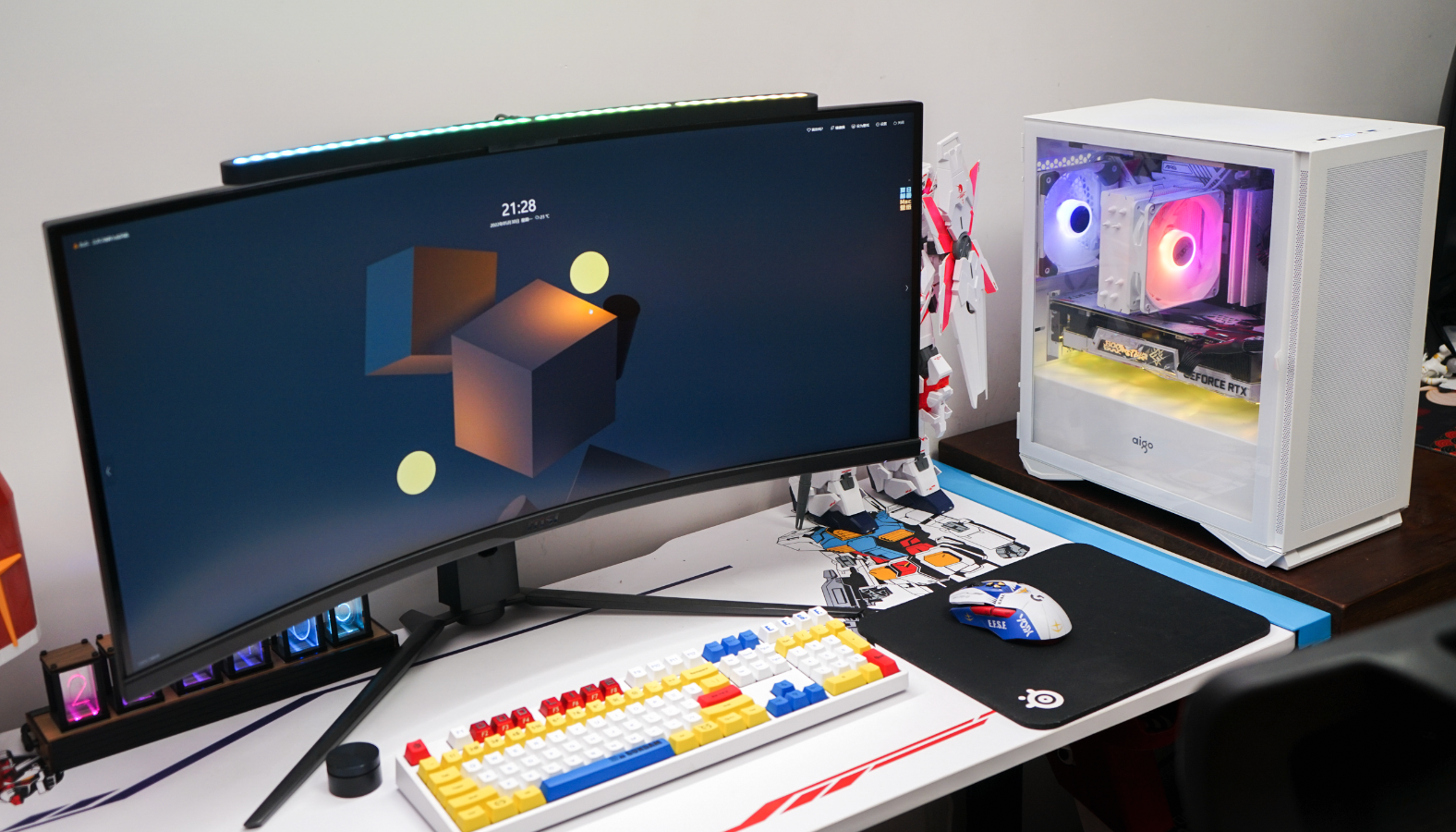 与我的显示器微星MPG ARTYMIS 343CQR月神来个合影。可以看到aigo YOGO M2高性能版要比这款34英寸的曲面显示器小很多。