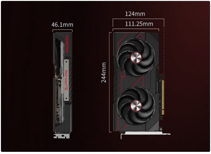 蓝宝石RX 9060 XT 8G脉动显卡延续此前白金版的外观设计,主色调以黑红为主,但造型上增加了更多棱角和装饰纹理。显卡尺寸为240×124×46.1mm,属于双风扇小尺寸显卡,可兼容各类ITX机箱。