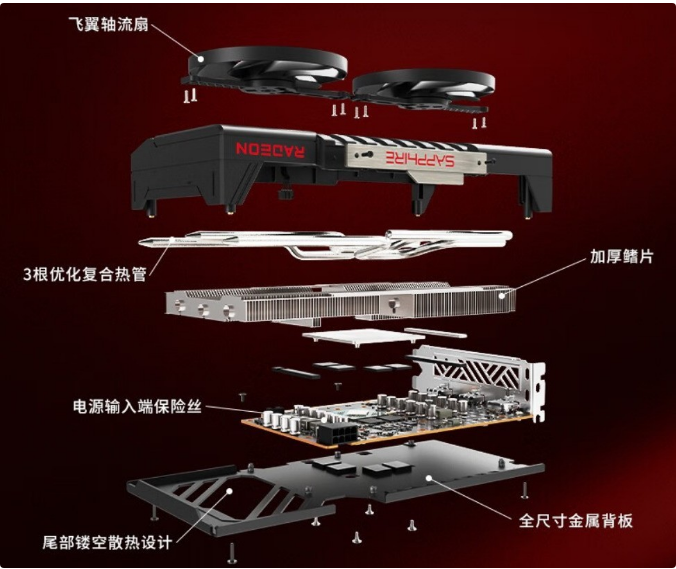 为了保障性能充分发挥,蓝宝石RX 9060 XT 8G脉动配备一体式散热模组,3根优化复合热管贯穿大面积的加厚鳍片,搭配PTM7950超导热膏盒两只双滚珠轴承飞翼轴流扇,进一步提升散热效率。一体式框架导风罩搭配全尺寸尾部镂空金属背板,有效提高显卡的机械强度,并兼具辅助散热效果。