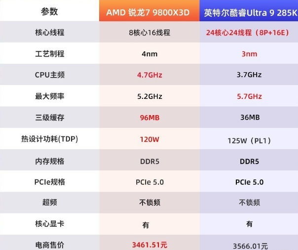 参数上,AMD锐龙7 9800X3D采用台积电4nm工艺打造的Zen5架构,8核心16线程全大核设计搭配SMT同步多线程技术,拥有120W TDP。英特尔酷睿Ultra 9 285K这次则首次采用台积电代工3nm工艺制造,配备了24核心24线程,但要注意,英特尔这代产品依旧采用性能混合架构设计,但取消了超线程,所以只保留8个性能核(P-Core),其余16个均为能效核(E-Core)。两款处理器在缓存和频率的差异比较明显,AMD锐龙7 9800X3D拥有96MB三级缓存,远超对面。而英特尔酷睿Ultra 9 285K的性能核睿频更高,但基准频率不如AMD锐龙7 9800X3D高。