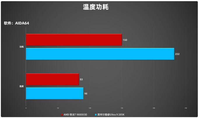 AMD 锐龙 7 9800X3D能耗比也十分出色,并非单纯通过拉高功耗来提升性能表现。我们测试发现这款处理器在拷机时最大功耗只有150W左右,温度在83℃,相当于仅需隔壁旗舰三分之二的功耗就输出了105%的性能表现。因为锐龙9000X3D对比上代这次更注重温度表现,从芯片封装就进行了针对性翻转核心设计,提升散热效能,解决了游戏玩家痛点积热问题,从而实现帧数、功耗、温度三方面的全面突破,因此才能成为受大家欢迎游戏处理器。