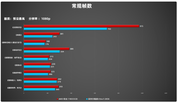 常规帧数测试结果如图所示,AMD 锐龙 7 9800X3D在这9款游戏中均有更出色的帧数表现,尤其是网络游戏,帧数差距很大。这是因为网游会频繁处理实时数据流,超大三级缓存意味着能存储更多常用数据,降价幅度较大从而提高缓存命中率,显著提升CPU数据访问效率,减少内存延迟,从而让游戏可以稳定维持高帧率。而且也能看出来3A游戏虽然没有网游那么吃缓存,但大缓存因为能更频繁加载纹理、模型等游戏资源,所以依旧能在3A游戏中获得更好帧数表现。即使英特尔酷睿Ultra 9 285K的性能核拥有更高的频率,也无法撼动AMD 锐龙 7 9800X3D的游戏成绩。