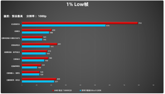 1% Low帧方面,AMD 锐龙 7 9800X3D的表现同样强势,除了《怪物猎人:荒野》打平外,其余游戏的1%Low 帧表现均超过了英特尔酷睿Ultra 9 285K。1% Low帧是游戏中最差1%帧数的平均值,代表游戏性能的下限。越高越不容易遇到卡顿,比如玩魔兽这种动不动就20人起步的团本,1% Low帧稳定越高就越丝滑,尤其如果是正式服技能特效以及BOSS底板技能多的时候,关键时卡一下可能就得等复活了,所以这也是为什么一些经常混工会组队打BOSS的玩家在听到队友想要换电脑时,总会优先推荐X3D处理器的原因。有时候激烈团战时电脑帧数稳定流畅,可能比熬夜练手法都要管用。
